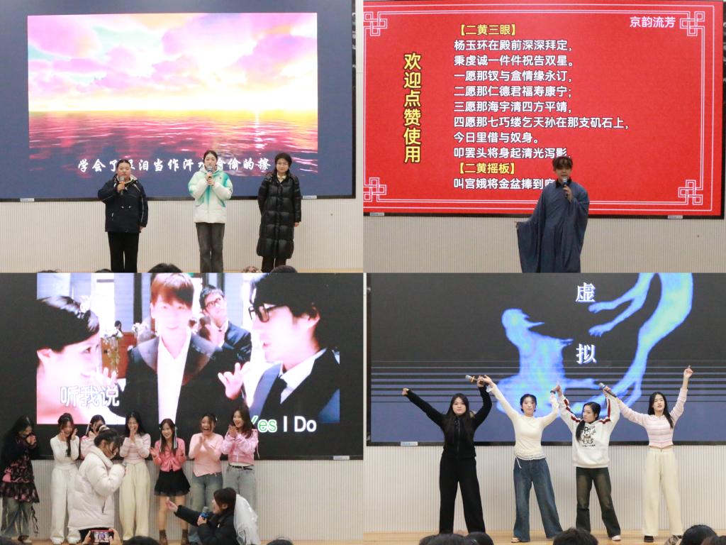 开场曲《恭喜发财》以欢快旋律点燃全场,演唱者的饱满热情与灵动表演引得观众拍手应和。紧接着,同学们的温情合唱传递新年期许,《交换余生》的深情演绎让观众沉浸其中,相声《我也有才艺》凭借新颖形式与趣味内容逗乐全场,田的汝同学的京剧唱段《太真外传》更以铿锵唱腔、韵味表演惊艳众人,尽显传统文化魅力。