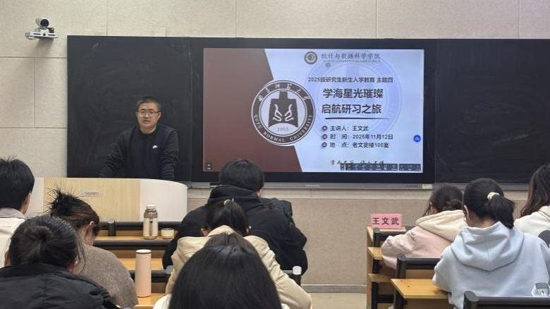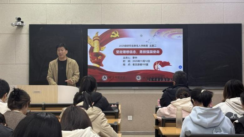 于11月12日在老文史楼105室举办2025级研究生新生入学教育大会,邀请了院长赵胜利、党委副书记季中、研究生工作负责人王文武、研究生导师尤洪龙和研究生辅导员管阳为新生开展入学教育。