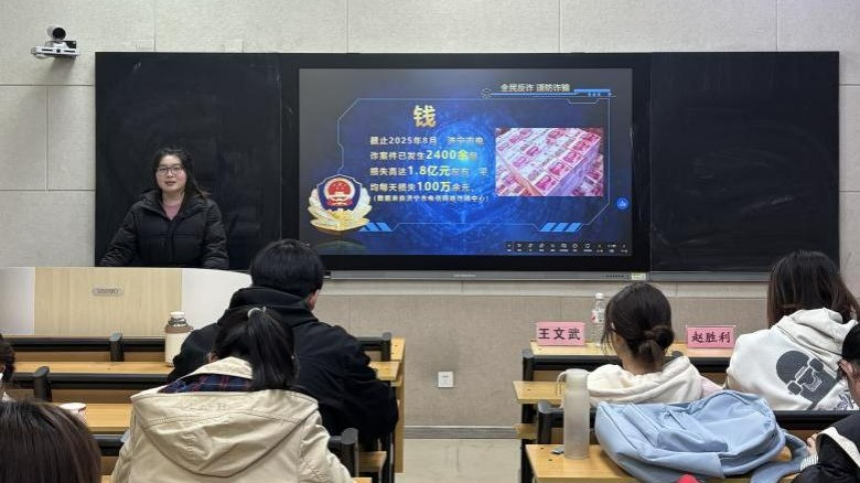 大会第五项,管老师聚焦于“防范电信诈骗”议题,带来了一场“反诈知识盛宴”。管老师剖析了电信诈骗的特征,结合校内案例数据揭示了高发骗局规律,指出学生常见防范误区,并传授“不轻信、不转账、多核实”的实用防骗口诀,有效提升了新生的识骗、防骗能力。