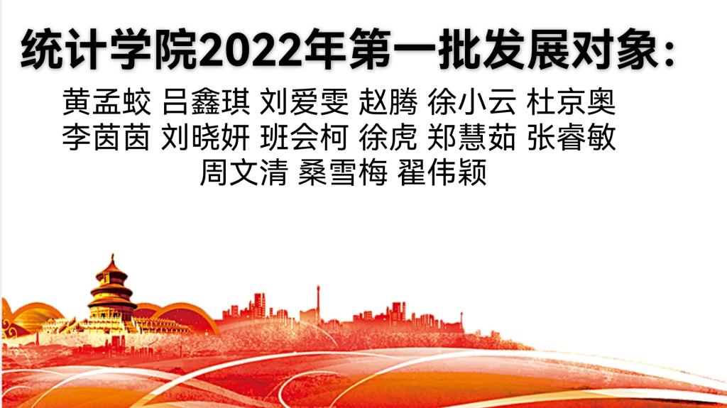 2022年第一批发展对象共有15人,分别为黄孟蛟、吕鑫琪、刘爱雯、赵腾、徐小云、杜京奥、李茵茵、刘晓妍、班会柯、徐虎、郑慧茹、张睿敏、周文清、桑雪梅、翟伟颖。这15位同学在学习中锐意进取,在生活和工作中态度端正,为学生起到了模范带头作用,作出了良好的表率。相信他们会在赌博网站